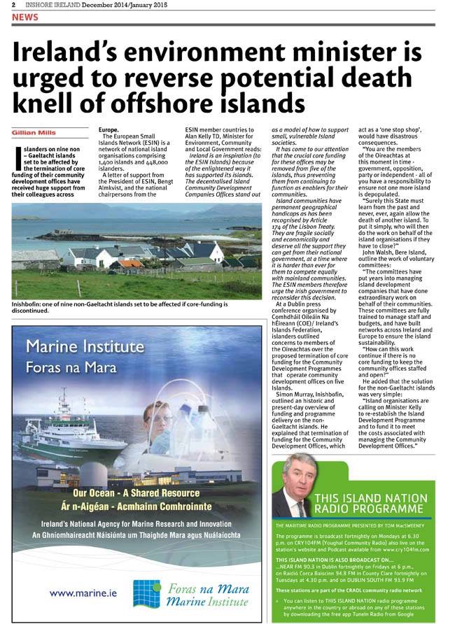Communities on nine off–shore Islands are shocked at the news that the Irish Department of the Environment, Community and Local Government is to terminate funding to their five Community Development Companies Offices as and from December 31st, 2014.