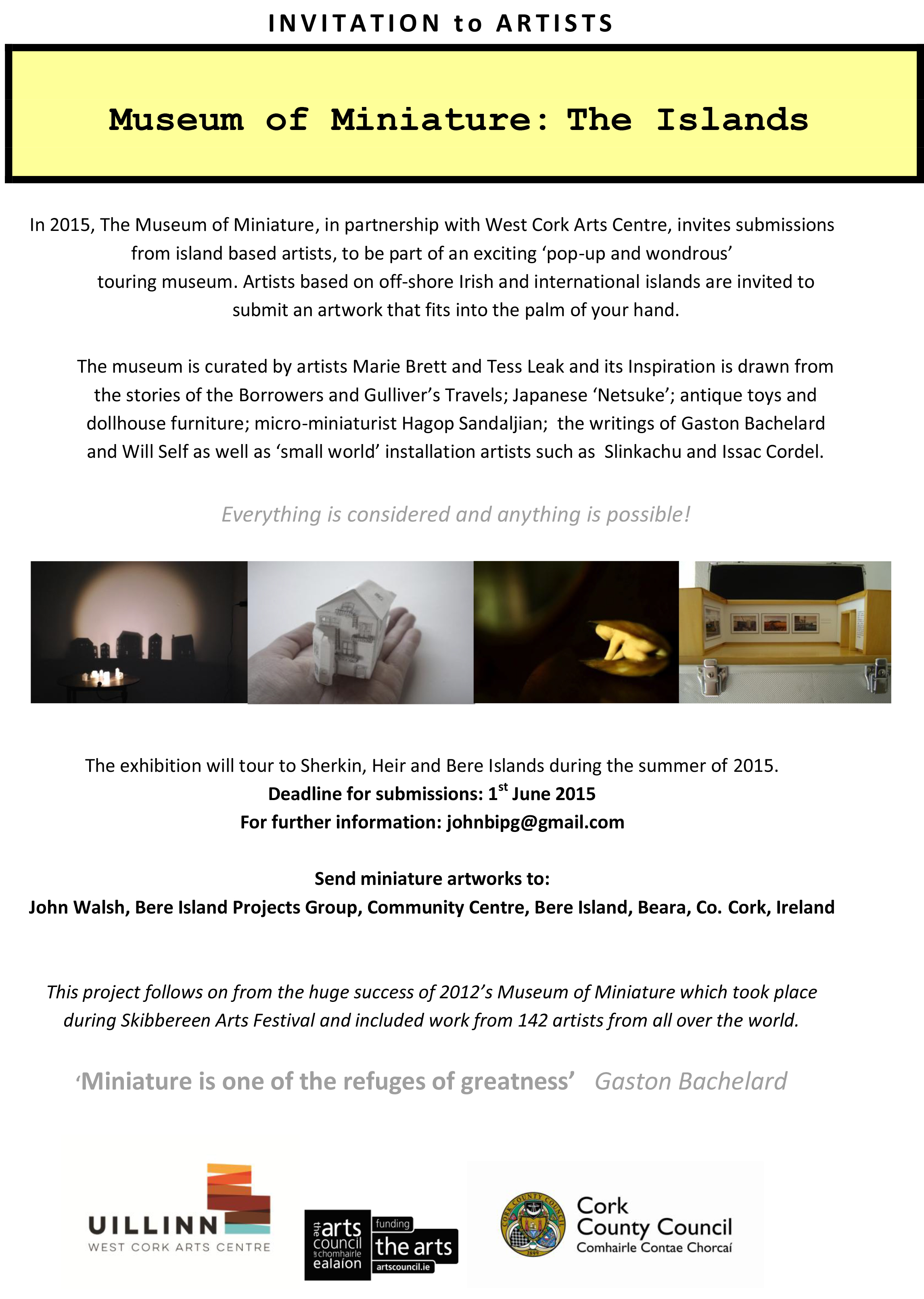 You remember Gulliver’s travels to Lilliput? Well, Lilliput was an island, a miniature of the big world, just as every island is a projection of myths, dreams and ideas. Artists Marie Brett and Tess Lea have been inspired to invite island artists to exhibit artwork that fits into the palm of your hand. Their moveable museum will tour Sherkin, Here and Bere islands in West Cork this summer, see the invitation attached.