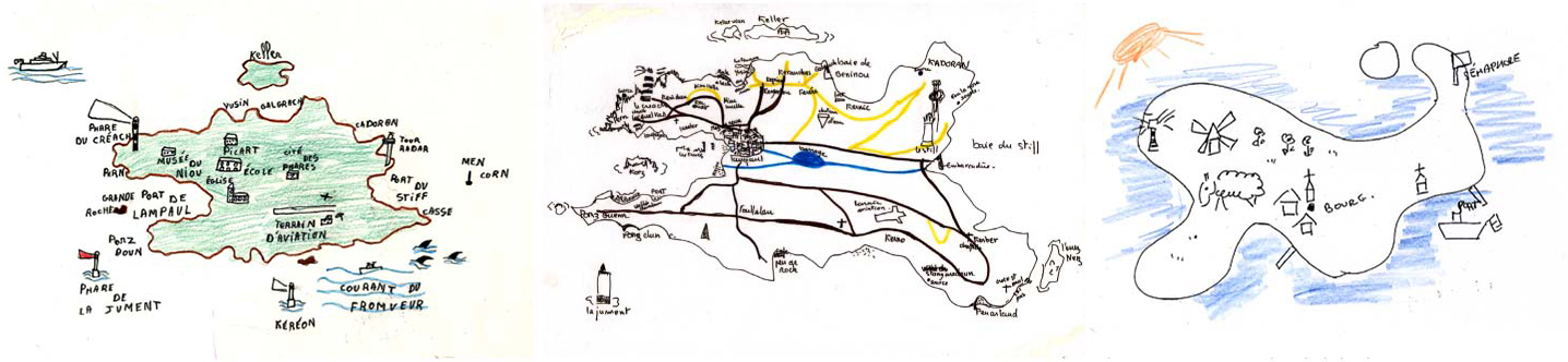 Here are three drawings of Ouessant: one made by an islander, one by a part-time resident, and one by a tourist; three different pictures of the same island. I also attach a map with the real (?) distance to Ouessant, given the transport time.