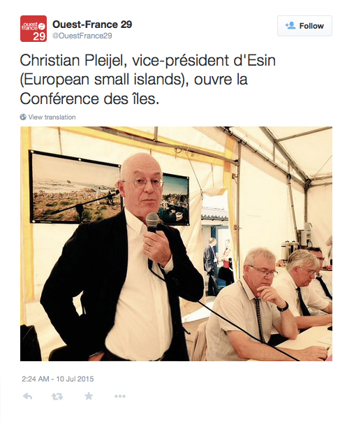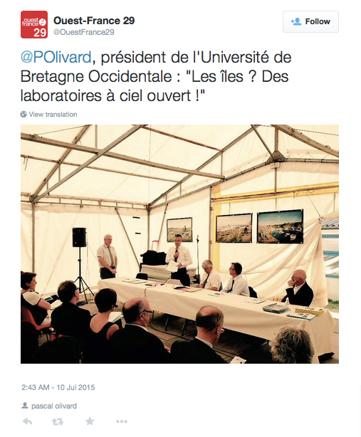 Here are some pictures from the event: the prime minister Mr Manuel Valls; a pair of twitters from the newspaper France Ouest with yours truly and the President of the Brittany University saying: ”Islands? Open-air labs!”; the AIP board on the steps of the Mairie with almost all of the island mayors; and the signing of the contract with Denis Palluel in a tie (!) and a jacket (!), the Regional Minister for Bretagne, and the Prime Minister.