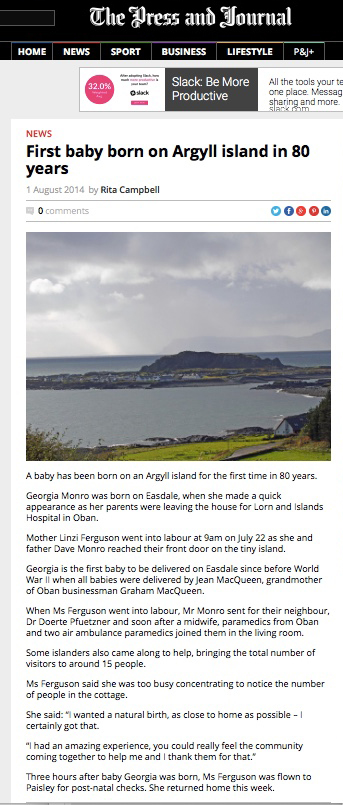It seems almost everybody of the 70 inhabitants played a part in her safe delivery into this world last July. She is the daughter of Lyndsay and Dave Munro and, as her time approached, a helicopter complete with doctors and midwives was scrambled to fly her to Paisley and the security of a consultant-led team. “However, she had obviously waited long enough,” said Lyndsay, “and decided to make an early entrance. The midwives and doctors simply decided to make the house a maternity ward as it became clear there would be no birth in Paisley that night.”