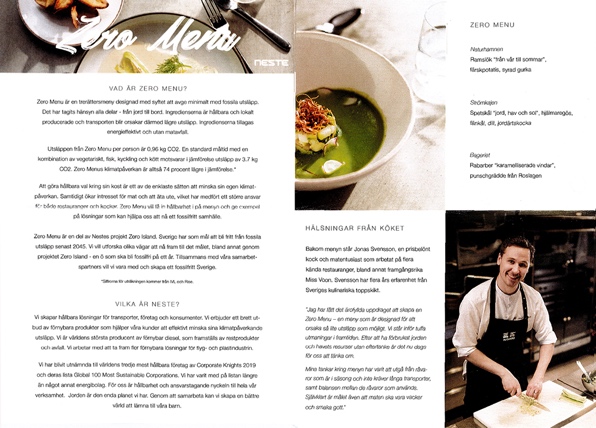 þ ”Zero Menu” – a food menu that is as locally produced as possible, with as little waste as possible, and as little transports as possible. The menu has been produced by chef Jonas Svensson and has reduced the emissions from making a 3-course dinner from standard 3,7 kg CO2 to 0,96 kg CO2.