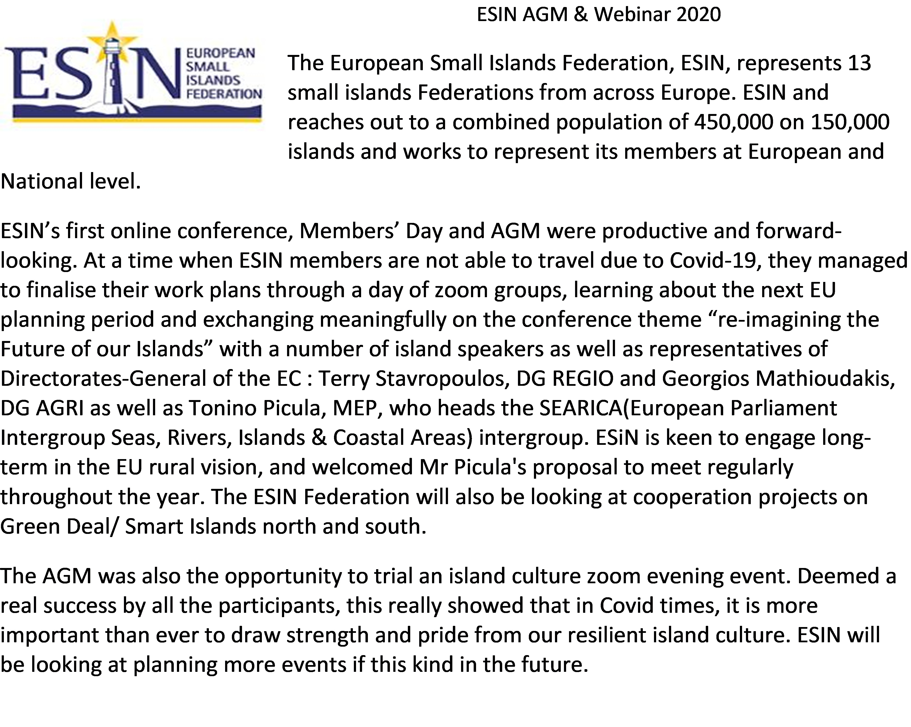 Annual General Meeting 2020 ESIN Annual General Meeting 2020 AGENDA AGM 2020 Agenda Minutes ESIN AGM 2020 Press Release AGM 2020 Press Release Island Culture Mash-up Culture MashUp AGM/Conference Timetable AGM Conf Time Share this:Share Click to share on X (Opens in new window) X Click to share on Facebook (Opens in new window) Facebook Like Loading...